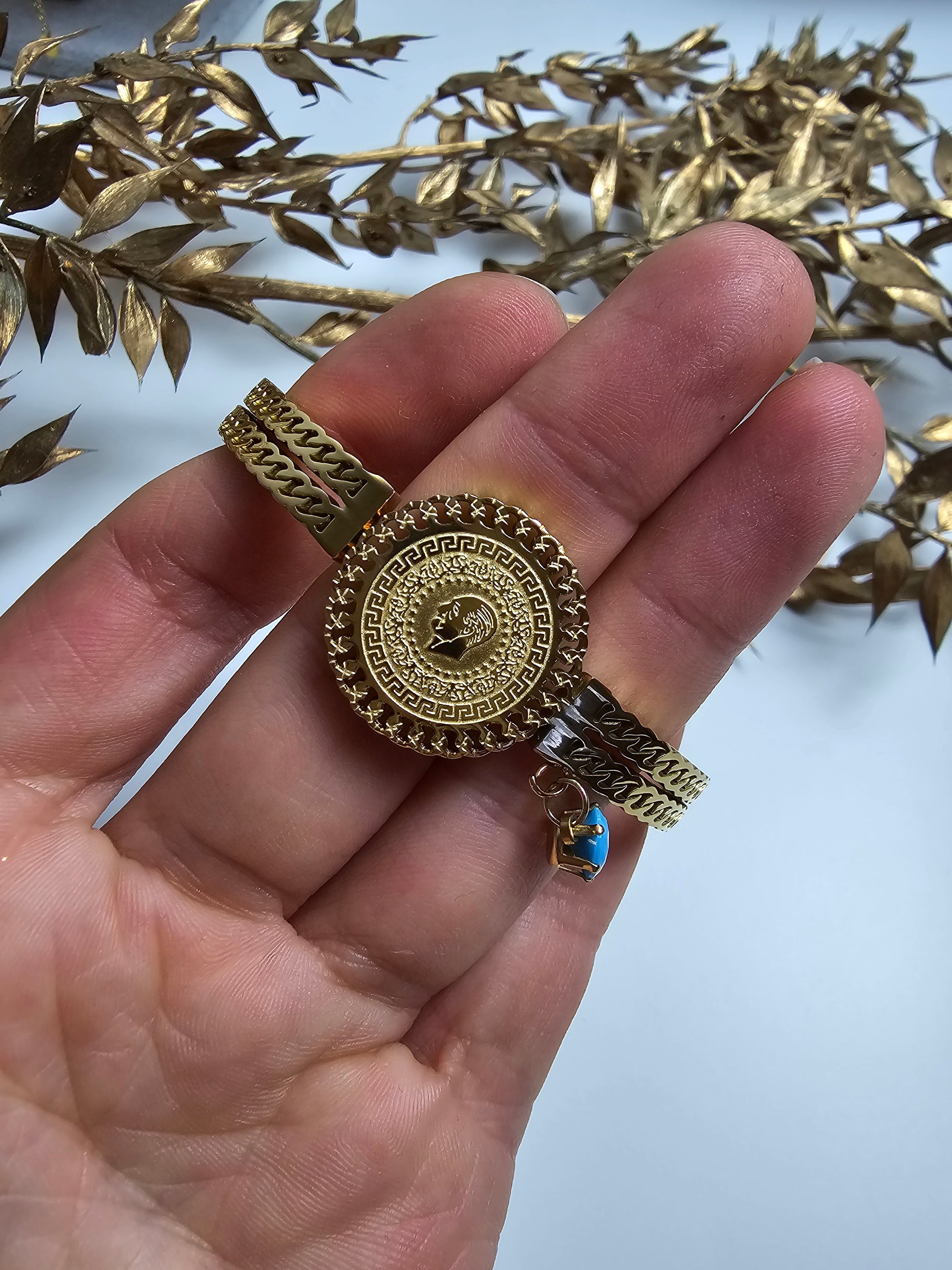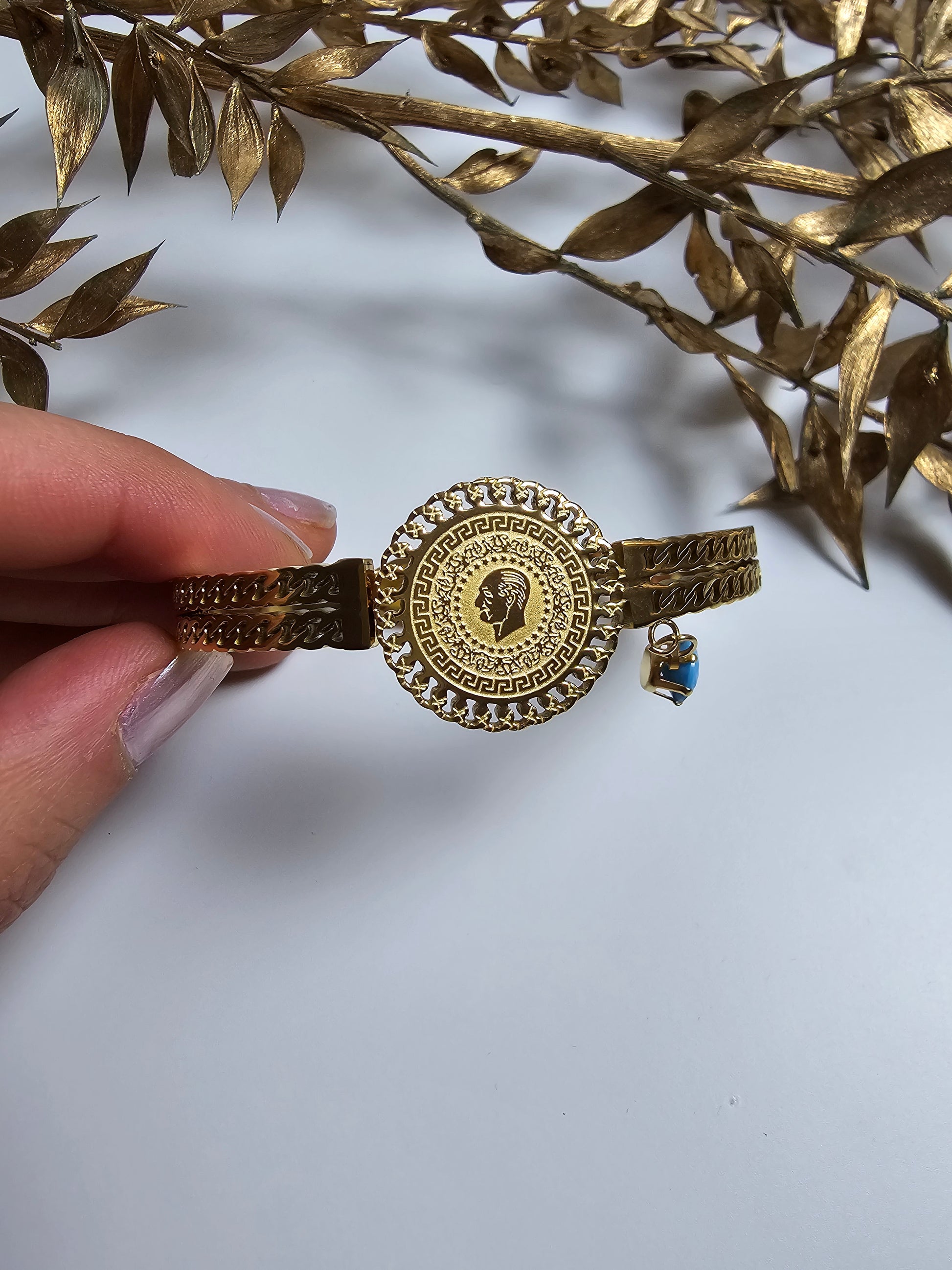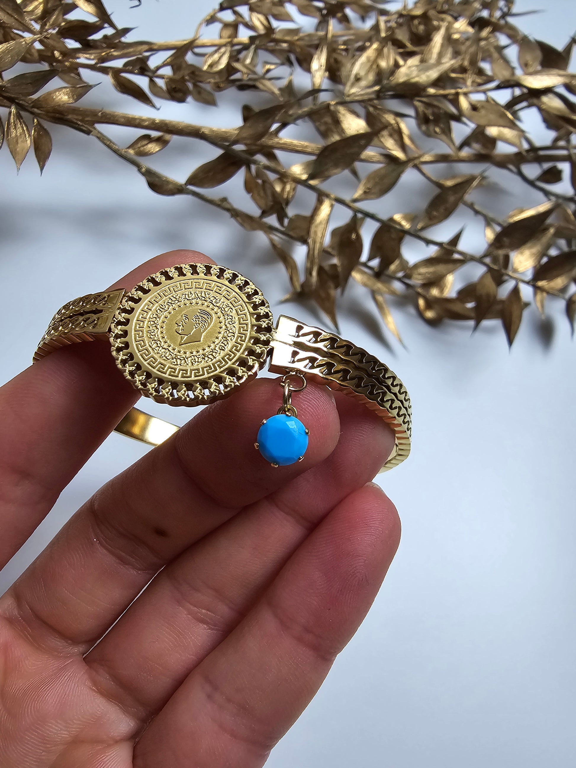 Traumhafte Münzarmreifen mit einem blauen Stein.